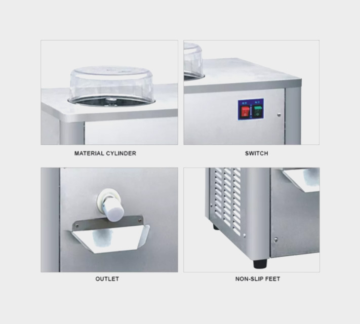 Product Feature: •Voltage /Frequency: 110~240V, 50/60HZ •1 Flavor hard ice cream machine •Brand compressor, low noise, less power consumption •Food grade 304 stainless steel cylinder. •Easy to operate, easy for cleaning •Speed freezing •Whole stainless steel body •With non-slip feet